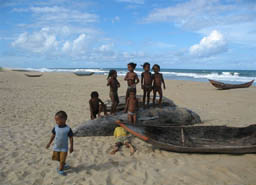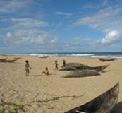 with sand. Dark-skinned fishermen paddle pirogues carved